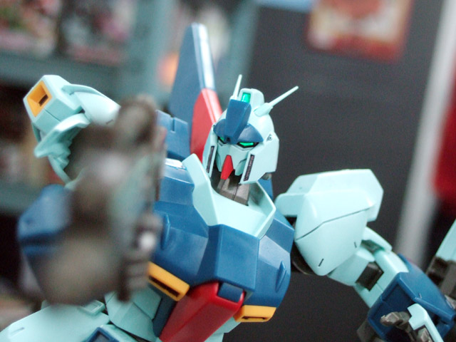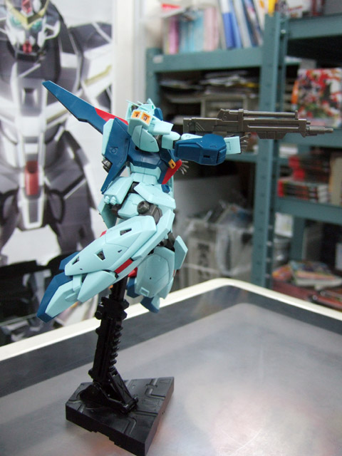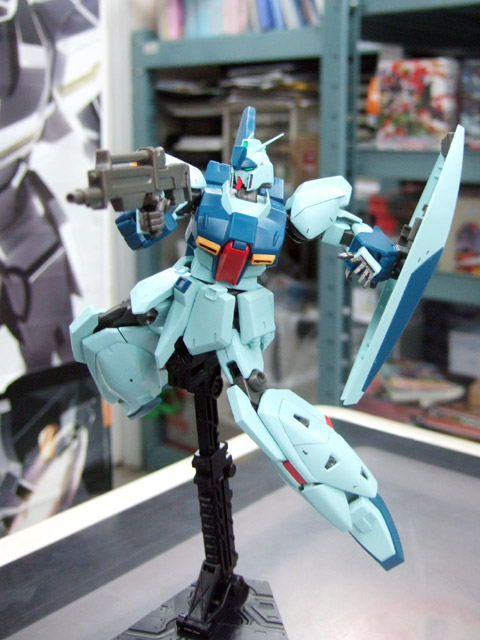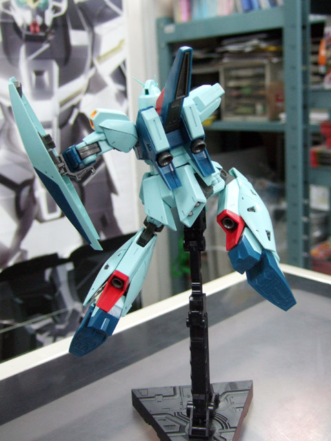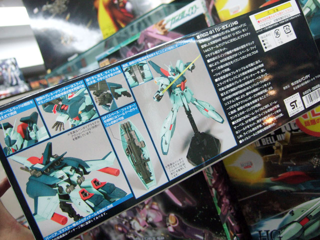 これは、以前サンプル展示をお伝えしたことのある、「機動戦士ガンダム 逆襲のシャア」に登場する、Wikipediaによると「アナハイム・エレクトロニクス社が同社の傑作機Ζガンダムの量産を指標とし、少数生産されたΖプラス・シリーズ以上の低コスト化を目指した機体。」という、「リ・ガズィ(Refine Gundam Zeta)」をHGUCプラモデルとして立体化した、HG逆シャアシリーズ第3弾となるもので、Amazonの商品説明によると「機動戦士ガンダム逆襲のシャア」より『リ・ガズィ』がHGUCに登場!BWS(バック・ウェポン・システム)によるスペースファイター形態への変形機構を再現。変形機構には一部差し替え式を採用し変形ギミックの遊びやすさを追求。スペースファイター形態は機体の厚みを抑えることにより航空機らしいプロポーションを追求。脚部には伸縮ギミック採用。バーニア、アポジモーター等内部のメカディテールを精密に再現。BWS単体でのディスプレイのためのアクションベース接続ユニットを付属。付属武器は、ビーム・ライフル、シールド、及びビーム・サーベル。」と紹介されています。