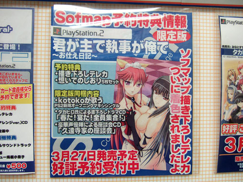 「これを買わないとエロゲーマーとしてどうよ?レベルなビッグタイトル」として発売された、エロゲ「君が主で執事が俺で」(AA)のPS2移植版「君が主で執事が俺で~お仕え日記~限定版」(AA)が3月27日発売予定です。ソフマップアミューズメント館では、そのショップ特典の、朱子と森羅乳合わせイラストのカラーサンプルが掲示されていました。とても直球でエロスギw