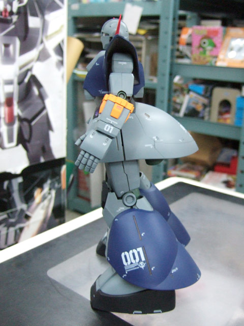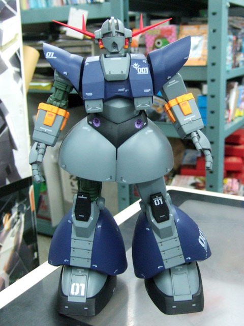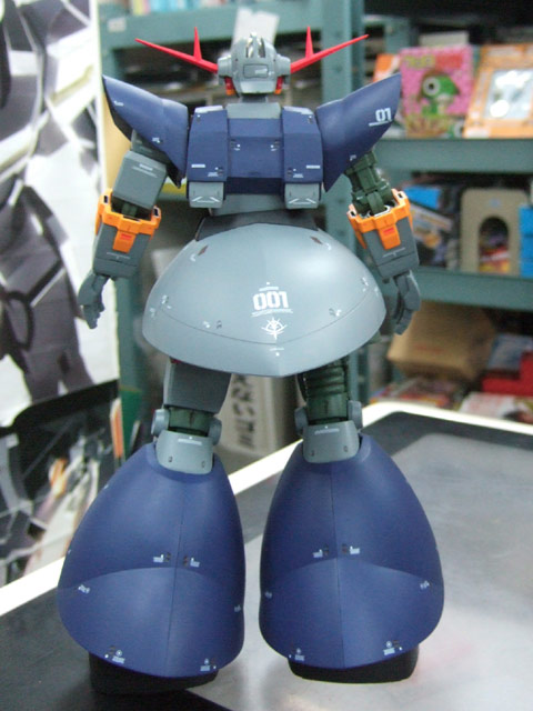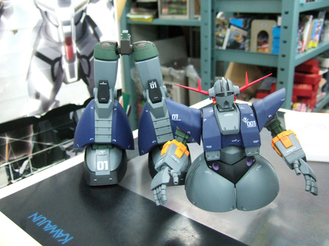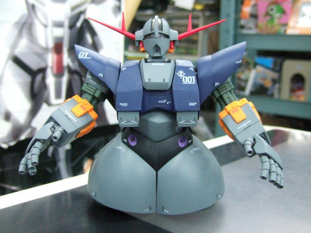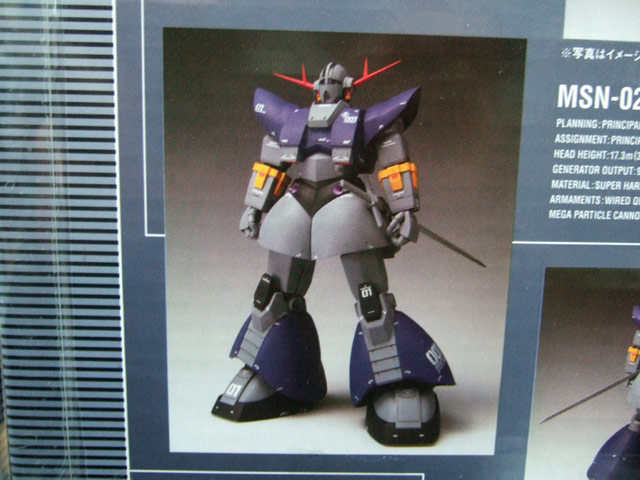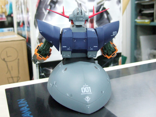 Wikipediaによると『ジオングに足が付いた完成形態(型式番号:MSN-02)。これにより地上での運用も可能になるが、スラスターが脚部になった為、機動力は低下した。初出はバンダイのプラモデルのMSVシリーズで、元々脚部はデザインされていなかったのだが、プラモデルの改造ですでに発売されていた1/144のキットに1/100のドムの足を取り付けるアイデアが流行した事があり、この改造例がデザインの元になったようである。やまと虹一の人気漫画『プラモ狂四郎』に「足付きジオング」として登場して人気機体となり、後に様々なゲーム作品にも登場。』という、パーフェクト・ジオングにした状態の全身前後。