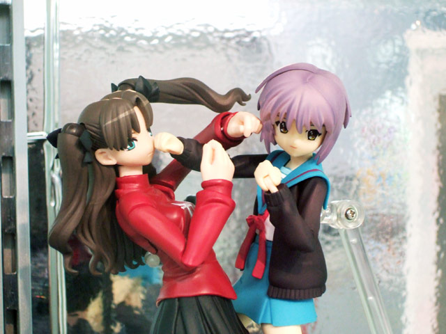 最近多くなってきた、美少女可動フィギュアですが、その中でも代表的なシリーズといえば、海洋堂のリボルテックフロイラインと、マックスのfigmaの名が挙がり、双方の対決に注目している方も多いと思います。そのフロイライン「遠坂凛」(AA)とfigma「長門有希」(AA)がとらで具体的にガチンコ対決してましたw