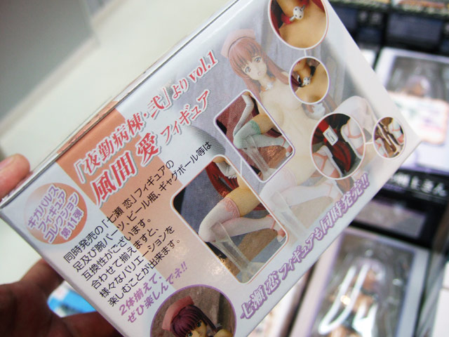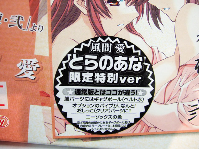 張られていたシールには「通常版とはココが違う!顔パーツにはギャグボール(ベルト赤) オプションのバイブが、なんと!おしっこ(クリア)パーツに!!ニーソックスの色」と書かれていました。