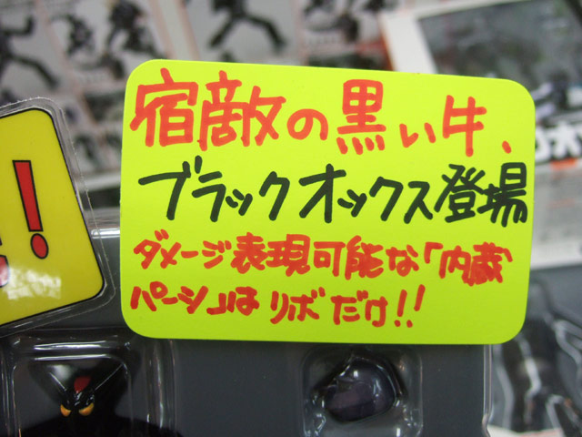 また、POPに『宿敵の黒い牛、ブラックオックス登場 ダメージ表現可能な「内蔵パーツ」はリボだけ!!』とした、パッケ内容のサンプルも展示していました。