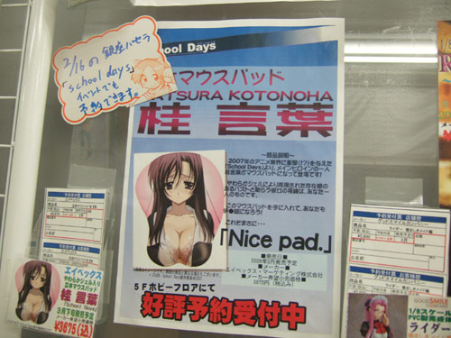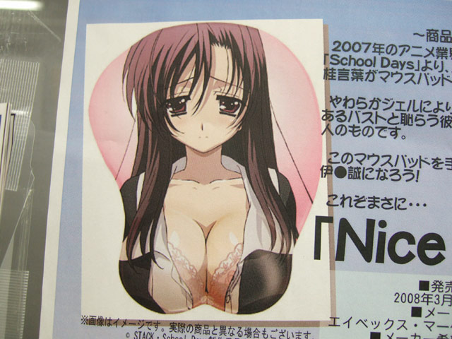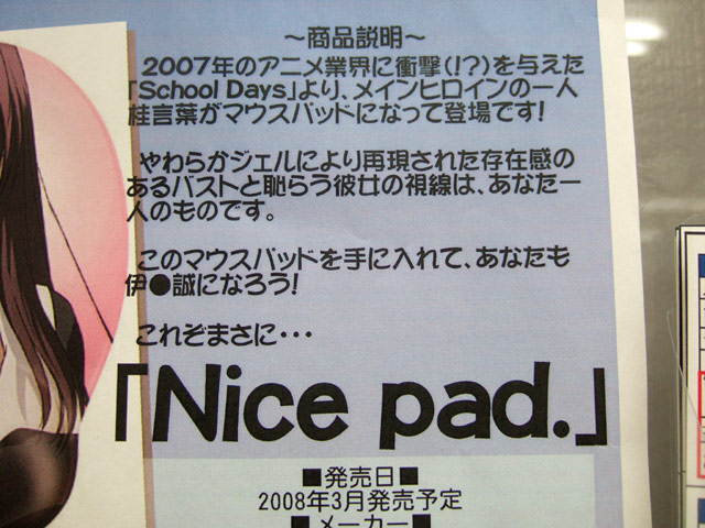 イラストは、言葉様の制服の前がはだけ、ブラと谷間が見えているイラストとなっていますw とらのPOPの商品説明によると『2007年のアニメ業界に衝撃(!?)を与えた「School Days」より、メインヒロインの一人桂言葉がマウスパッドになって登場です!やわらかジェルにより再現された存在感のあるバストと恥らう彼女の視線は、あなた一人のものです。このマウスパッドを手に入れて、あなたも伊●誠になろう!これぞまさに・・・「Nice pad.」』と紹介されていますw