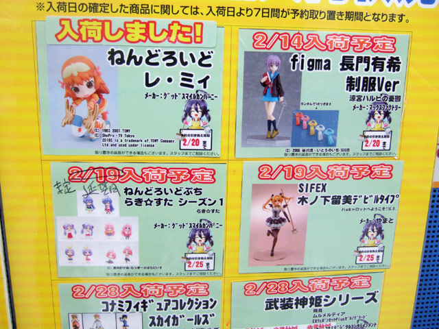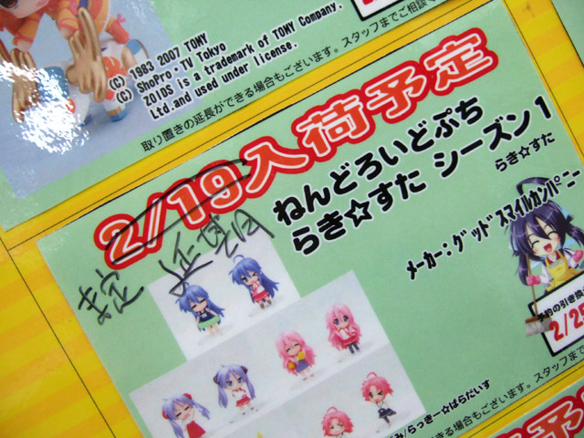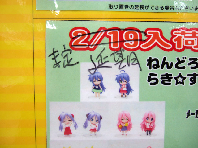 公式でも発表されていますが、ソフマップアミューズメント館のPOPによると、サークルKサンクスで先行販売されている、グッドスマイルカンパニー「ねんどろいど ぷち らき☆すた シーズン1」(AM)の一般販売分の発売日が、「製造上の都合により」2月19日予定から未定に延期されたみたいです。他、いくつか新しい入荷予定が貼り出されていたので、まとめてお伝えします。