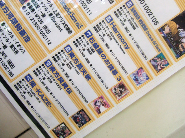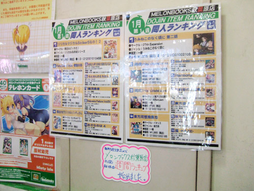 とらのあなとメッセサンオーは以前から同人誌ランキングを公開していましたが、今年からメロンブックスでもPOPに「新年も迎えましたのでメロンブックス秋葉原店、同人誌・同人ソフト・CD週間ランキング始めました。」として、同人の週間ランキングを入り口付近に掲示していました。
