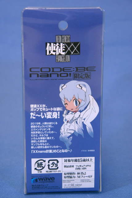 これは、2007年11月に発売された、「リリスXXnano!」(サンプルレビュー)を一部回収したカラバリとなるもので、ウェーブの商品説明によると『リリースされるやいなや早々に売り切れ続出となった大人気「使徒XXnano!」シリーズより、「CODE:BE」がnano!シリーズに限定製品として登場。製品は単に「リリス≒XXnano!」の色かえにするにとどまらず、表情をウインクに変更し、またカラー設定も吉崎観音氏によりブラッシュアップが施され一層魅力的になりました。』と紹介されています。