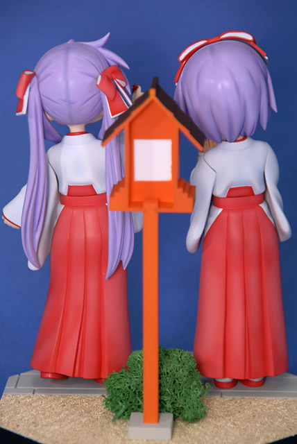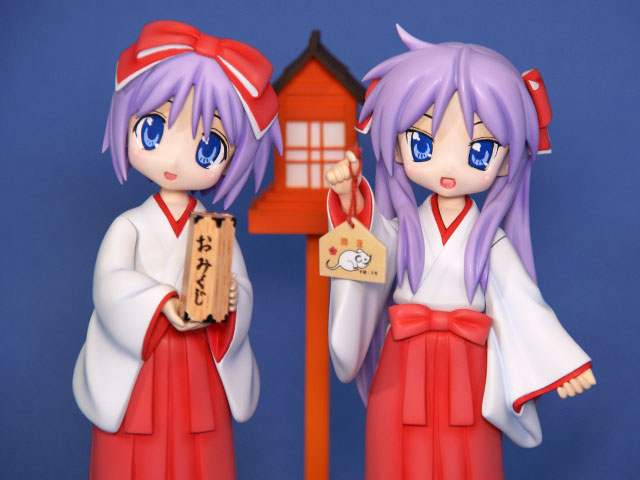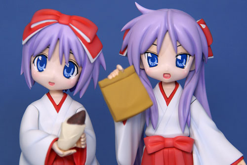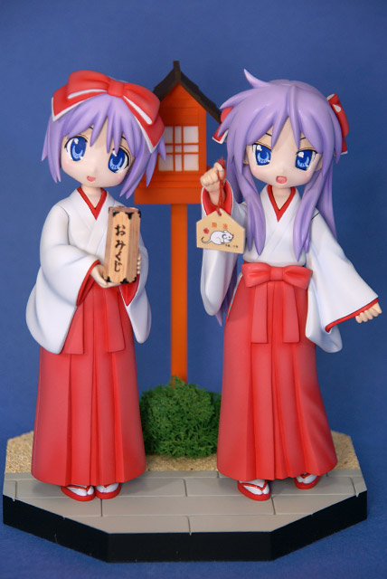 ウェーブ ドリームテック「柊かがみ」「柊つかさ」と、その限定セットとなる、「宮沢模型限定 初詣セット」(AM)、「あみあみ限定 やきいも☆どうぞセット」(AM)のサンプルレビューです。これは、ホビーコンプレックス 02東京の、鶴の館さんのブースで展示されていた、柊かがみと柊つかさをブラッシュアップし、PVC製完成品にするものです。巫女服で大きなサイズは初ですね!