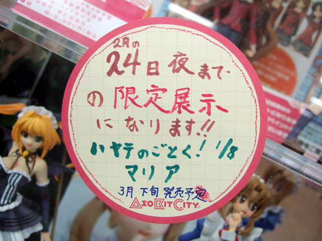 ジュンプランニング「ハヤテのごとく! マリア」(AM)のサンプル展示が、20日にキャラシティで開始していました。これは、「ハヤテのごとく!」のキャラ「マリア」を、彼女の仕事着であるメイド服で立体化した、ジュンプランニングの「ハヤテのごとく!」キャラ立体化シリーズ第1弾となるものです。掲示されていたPOPによると、2月24日夜までの限定展示となるみたいです。