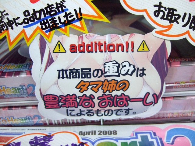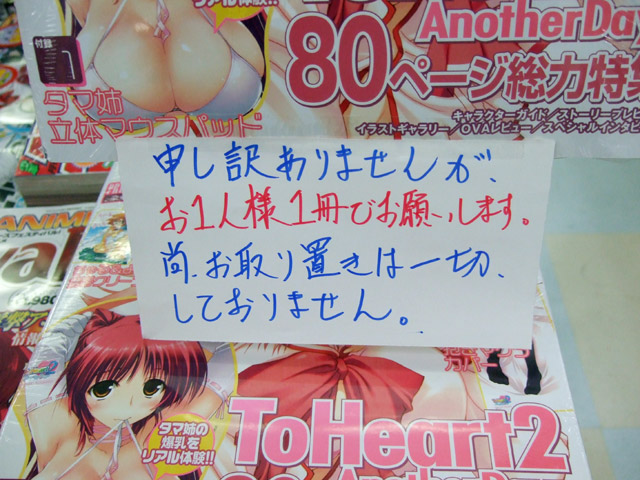 とらのあな1号店では、「addition!!本商品の重みはタマ姉の豊満なおぱーいによるものです。」「おっぱい!オッパイ!オッぱい!こちらの商品は大人気につきお一人様3部までとさせて頂きます。」「おっぱい品切れカウントダウン始動!!バカ売れですっ!もうすでに午前中に品切店が出ました!!」とかPOPに書かれていました。