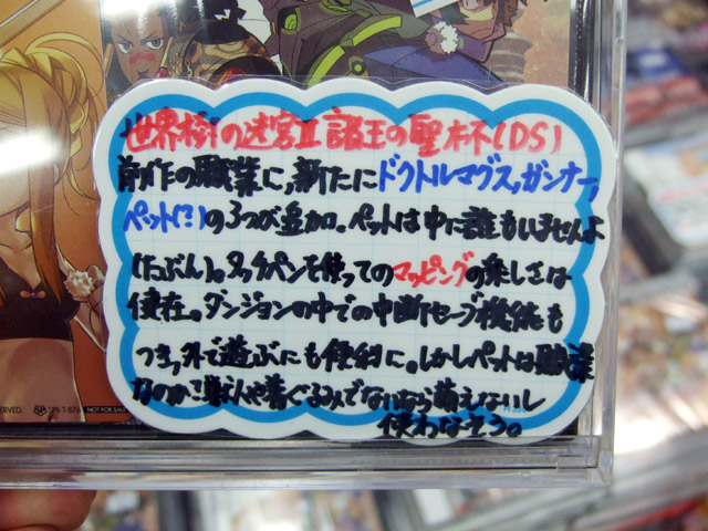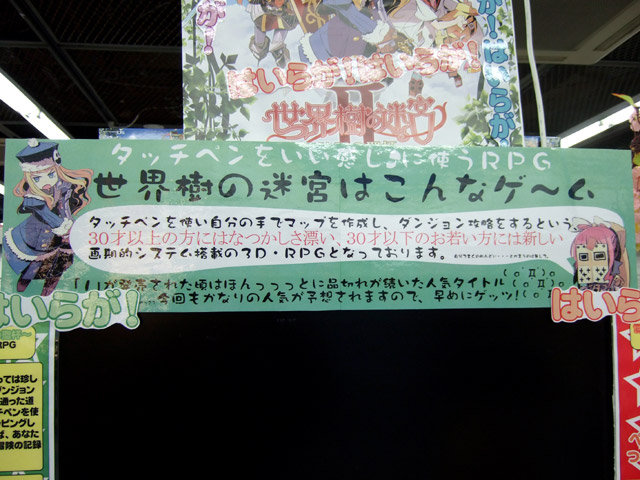 ソフマップアミューズメント館のPOPによると「タッチペンを使い自分の手でマップを作成し、ダンジョンを攻略をするという、30才以上の方にはなつかしさ漂い、30才以下のお若い方には新しい画期的システム搭載の3D・RPGとなっております。」『「1」が発売された頃はほんっっっとに品切れが続いた人気タイトル今回もかなりの人気が予想されますので、早めにゲッツ!』「前作の職業に、新たにドクトルマグス、ガンナー、ペット(?)の3つが追加。ペットは中に誰もいませんよ(たぶん)。タッチペンを使ってのマッピングの楽しさは健在。ダンジョンの中での中断セーブ機能もつき、外で遊ぶにも便利に。しかしペットは職業なのか?獣人や着ぐるみでないなら萌えないし使わなそう。」と書かれていました。