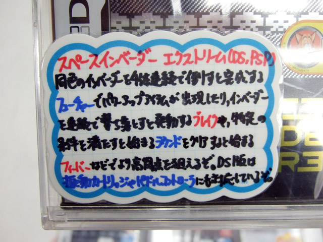 ソフマップアミューズメント館のPOPによると「同色のインベーダーを4体連続で倒すと完成するフューチャーでパワーアップアイテムが出現したり、インベーダーを連続で撃ち落とすと発動するブレイクや、特定の条件を満たすと始まるラウンドをクリアすると始まるフィーバーなどでより高得点を狙えるぞ。DS版は振動カートリッジパドルコントローラにも対応しているぞ。」とかかれています。