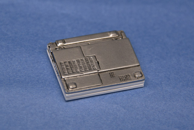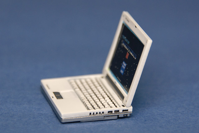 専属の原型師さんがこだわりぬいて製作されたというノートPCは、劇中でモデルにされた実在のノートPCなどを資料にして、可能な限り忠実に再現したらしく、PC側面はおろか、ちゃんとたたむことも出来、しかも背面もほぼ完璧なミニチュアとなっています。
