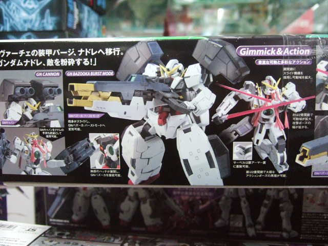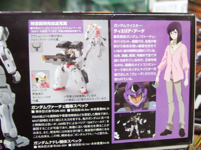 ガンダムヴァーチェは、POP側面の開設によると「対MSの範疇を大きく超えた火力を有する。他のガンダムに比べると機動性が低いが、GN粒子によるバリア『GNフィールド』を展開することが可能であり、無敵に近い防御力を得ることが出来る。また、緊急時には外装を切り捨て、軽装型の期待になることも出来る。この時、機体名は『ガンダムナドレ』へと変わる。」という機体。