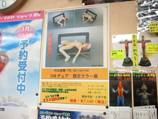 以前、サンプルレビューをお伝えしたことのある、ビーグル「村田蓮爾 PSE Collection CDBチェア」(AA)のビキニを白にしたカラバリで、あみあみ限定版となっていた「白版」(AM)ですが、コトブキヤでも数量限定で取り扱いが決まったみたいで、予約受付中のPOPが掲示されていました。他、おっぱい部分が立体になっている、「RIO リオ 胸部立体レリーフマグカップ」(RA)入荷等。