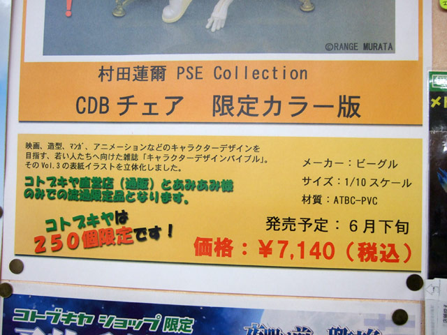 以前、サンプルレビューをお伝えしたことのある、ビーグル「村田蓮爾 PSE Collection CDBチェア」(AA)のビキニを白にしたカラバリで、あみあみ限定版となっていた「白版」(AM)ですが、コトブキヤでも数量限定で取り扱いが決まったみたいで、予約受付中のPOPが掲示されていました。