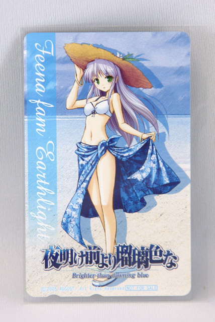これは、前述のテレカの絵柄に使われた、べっかんこう氏描き下ろしイラストを元に、「夜明け前より瑠璃色な」のキャラ「フィーナ」を立体化したもので、キャラアニの商品説明によると『PC、PS2、アニメーションと各メディアで大人気となった「夜明け前より瑠璃色な」のヒロインで、才色兼備な月のお姫様「フィーナ・ファム・アーシュライト」が爽やかな白い水着姿となりました。キャラクターデザイナー「べっかんこう」氏の描き下ろしイラストを元に、台座はビーチサイドをイメージしたものになりました。』と紹介されています。