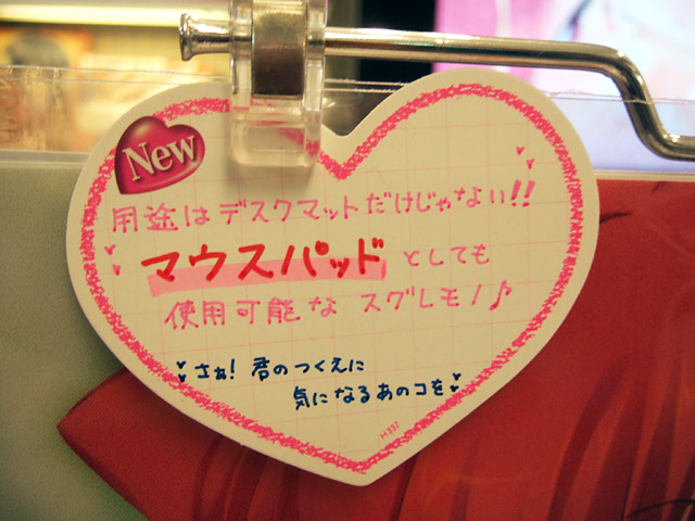 POPによると『用途はデスクマットだけじゃない!!(光学式)マウスパッドとしても使用可能なスグレモノ♪さぁ!君のつくえに気になるあのコを』と紹介されていました。