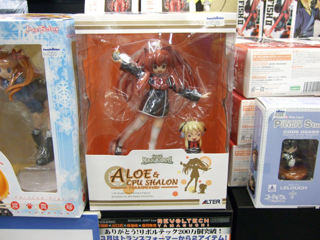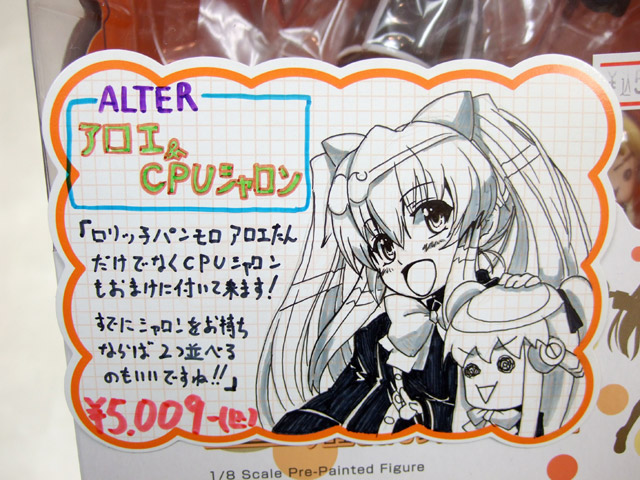 3月4日、アルター「クイズマジックアカデミー アロエ&CPUシャロン」(AA)が発売されました。これは、「クイズマジックアカデミー」のキャラ「アロエ」を立体化したもの。下から覗くとパンツがモロ見えなことからか、とらのPOPでは「ロリッ子パンモロ」w また「アロエたんだけでなくCPUシャロンもおまけに付いて来ます!」とも書かれているように、CPUシャロンも付属しています。