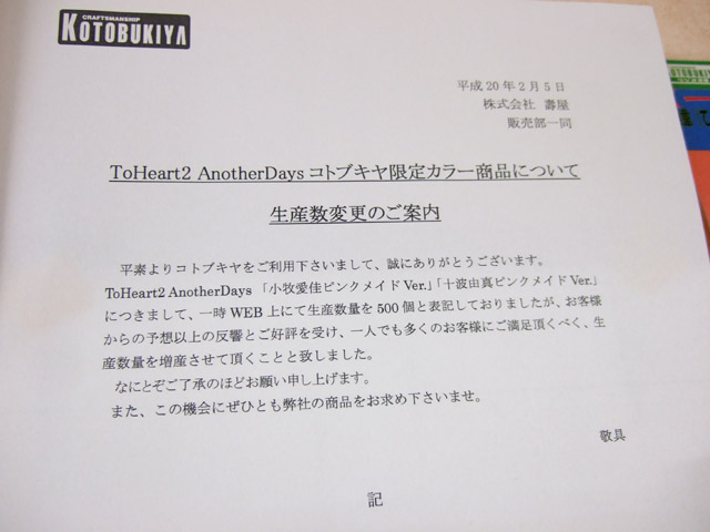 なお、掲示されていた「ToHeart2 AnotherDays コトブキヤ限定カラー商品について生産数変更のご案内」の告知のよると