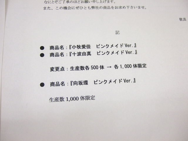 「小牧愛佳ピンクメイドVer.」「十波由真ピンクメイドVer.」につきまして、一時WEB上にて生産数量500個と表記しておりましたが、お客様からの予想以上の反響とご好評を受け、一人でも多くのお客様にご満足頂くべく、生産数量を増産させて頂くことと致しました。なにとぞご了承のほどお願い申し上げます。