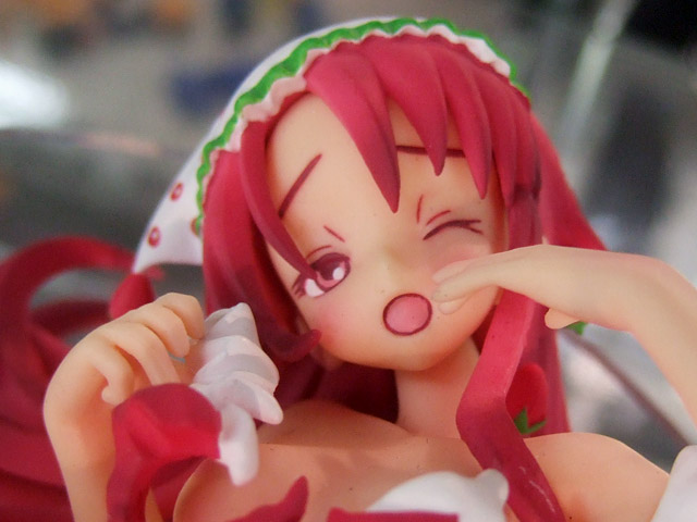 これは、ワンフェス2008冬でも展示のあった、okama氏が「マジキュープレミアム」で連載し、2006年3月に発売されたフルカラーコミック「Food Girls(フードガールズ)」(AA)のキャラ「ストロベリーちゃん」を立体化したもので、WF2008冬にあったPOPの商品説明によると「業界初!?香りつきフィギュア!!アニメ・マンガで活躍するokama先生が、『マジキュープレミアム』で連載していたオールカラーのマンガ「フードガールズ」から、キュートに擬人化されて人気の”ストロベリーちゃん”が、ポップでちょいエロな造型で立体化されました。全世界が注目するクリエイターokama先生の世界観を再現しさらに業界初!?ともいえるフィギュアから甘いイチゴの香りを発します!!ファンの方のみならずぜひ体験してほしい 完全キャストオフ&ストロベリーフレグランスフィギュアです。」と紹介されていました。