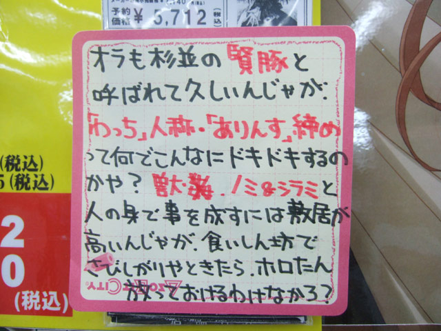 ゲームシティのPOPでは「オラも杉並の賢豚と呼ばれて久しいんじゃが、「わっち」人称・「ありんす」締めって何でこんなにドキドキするのかや?獣●、ノミ&シラミと人の身で事を成すには敷居が高いんじゃが、食いしん坊でさびしがりやときたら、ホロたん放っておけるわけなかろ?」と書かれていましたw