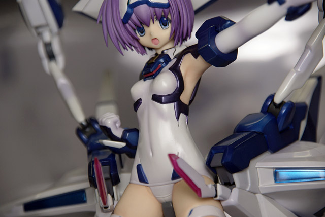 これは、ワンフェス2008冬等でも展示のあった、アルター「フェイト」(参考レビュー)の箱のサイズを「余裕で超えてます。」という「トリガーハート エグゼリカ」のキャラ「エグゼリカ」を立体化したもので、Amazonの商品説明によると「各戦闘ユニットは徹底監修によって細部も克明に再現した充実仕上がり。硬質なメカニック部と柔らかなエグゼリカ本体の対比が鮮烈。流麗かつ大迫力のフォルムを是非お楽しみ下さい。脚部の装甲は着脱式でエグゼリカ素体状態も再現可能。」と紹介されてます。