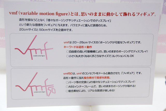 やまとの商品説明によると『2008年夏、衝撃のデビュー!!マクロス25周年企画として、あの「リン・ミンメイ」がvmf50の第一弾としてデビューです。立体のモチーフは劇場版マクロスでもっとも印象深い、リン・ミンメイが「愛・おぼえていますか」を熱唱する感動のラストシーンになります。あのステージ衣装を忠実に再現!衣装・グーロブ・ブーツを布で再現する事により、ボディの可動範囲を確保するだけでなく、生地の質感と服の自然なシワなどが表現され、本物のステージ衣装の高級感が楽しめます。新開発のオビツ製50cmボディの採用により、各関節が思いのままに可動!更に胴体部には軟質ソフビを使用し、女性的なボディラインと絶妙な動きやポージングが楽しめます。』とのことでした。