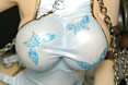 おへその穴が見えるくらいピッチリ密着したチャイナドレス。