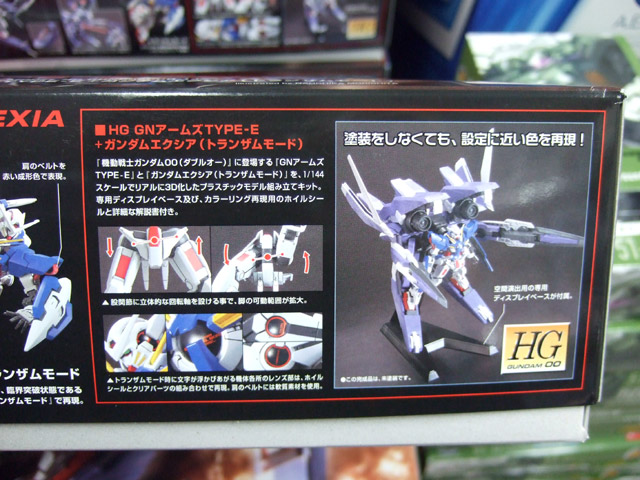 HGキットで再現する巧妙な可変武装!合体、可変武装により最終戦を完全再現。中心部にエクシアが搭乗し、各武器を構えることで攻撃シーンを再現。股のジョイントを使用しHGエクシアが取り付け可能。機体の機首を前方可動、脚部を折りたたみ、飛行形態を再現。腕ソード部は中央から折り曲がる機構を取り入れ、ソードアクションシーンを再現。機体の羽は上下に可動し、内蔵する小羽根を前方に可動し、劇中のシーンを再現。機体肩機構部には大型キャノンを装備、上下に方向転換し、砲身が前後にスライドし、砲撃シーンを再現。劇中の迫力あるシーンを再現する専用スタンド付属。番組登場シーンを合わせた『特殊仕様』のHGガンダムエクシア付属。アームやキャノン砲など各部が可動し、ポージングも思いのまま。