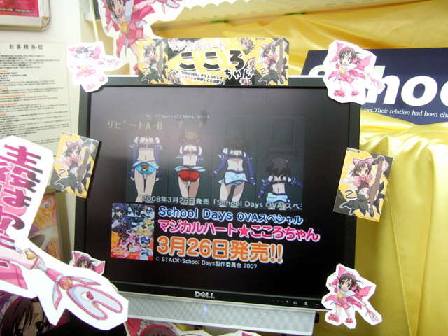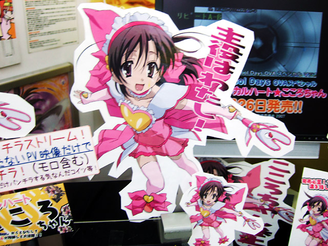 DVD「School Days~マジカルハート☆こころちゃん~(初回限定版)」(AA)が、3月26日に発売予定となっています。これは、「School Days」の言葉の妹のこころが魔法少女になって活躍?するOVA。とら本店ではPOP展開が開始されていて、「何このパンチラストリーム!2分にも満たないPV映像だけで17パンチラ!(モロ含む)」として、パンチラシーンを掲示していましたw