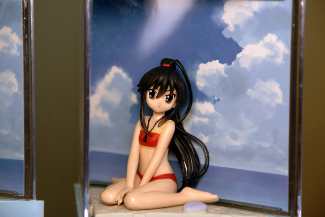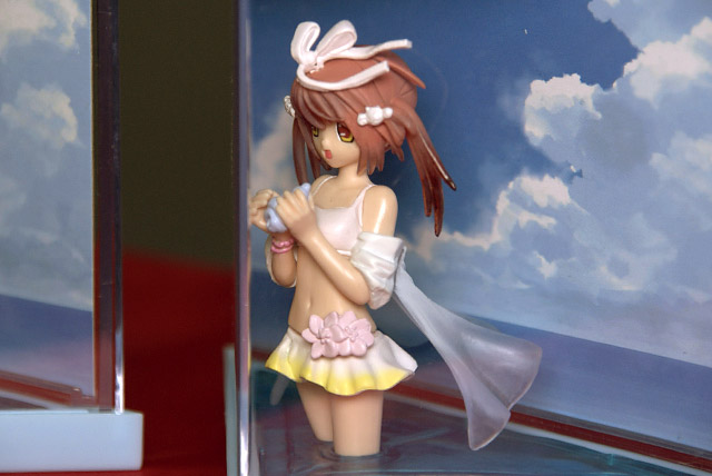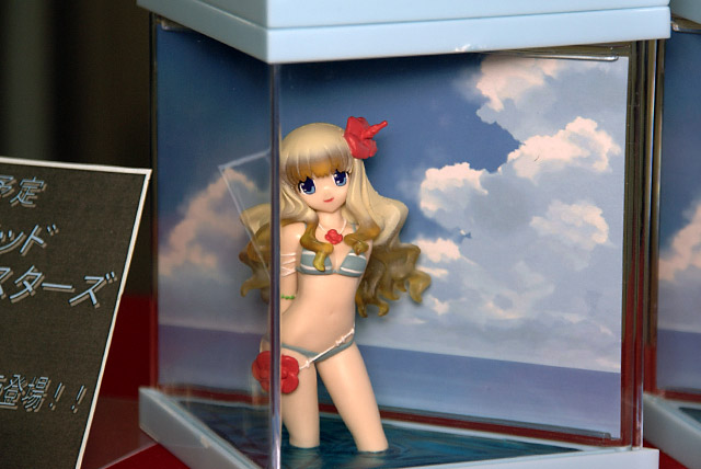 3月11日に開催された、宮沢模型展示会2008春のバンジハンエースブースでは、バンダイ「フィギュアマイスター ハーフプリズム シャナ&ななついろセレクション」(AA)のサンプルが展示されていました。これは、「灼眼のシャナ」「ななついろドロップス」2作品の、いとうのいぢ氏作画のキャラを、三角柱の背景付クリアケースが付属するトレーディングフィギュアにしたものです。