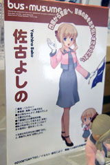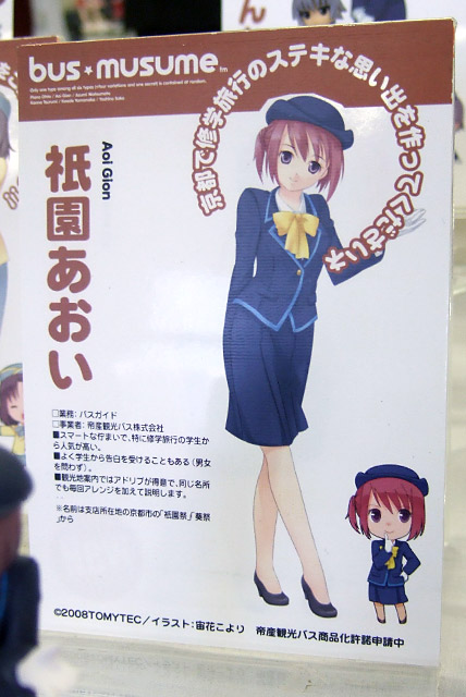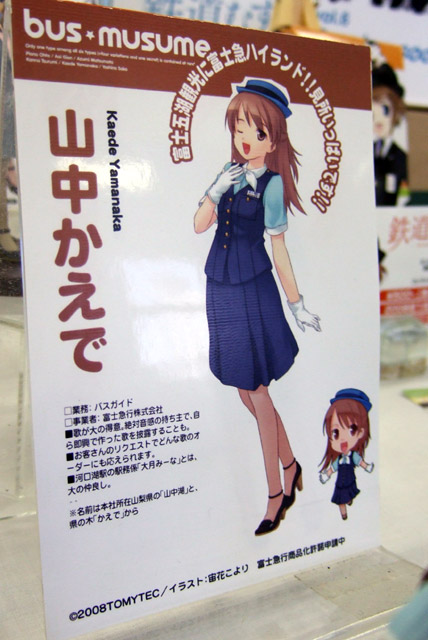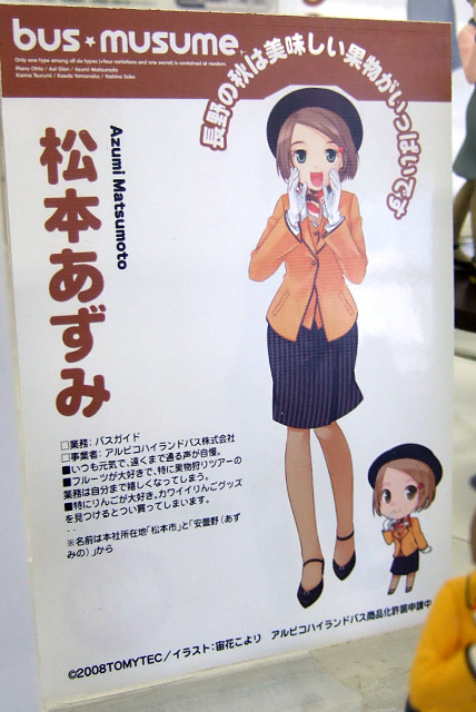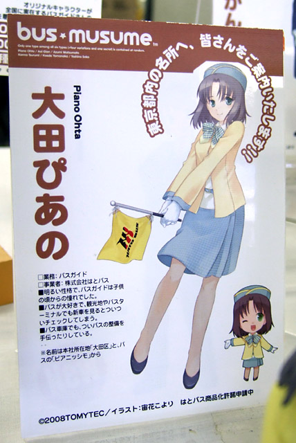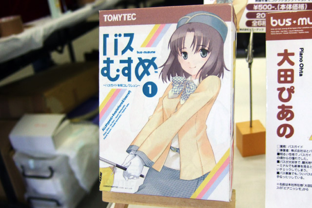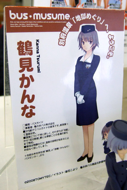 3月11日に開催された、宮沢模型展示会2008春のトミーテックブースでは、「バスむすめ バスガイド制服コレクション vol.1 」(AA)のサンプルが展示されていました。これは、バスむすめ公式の商品説明によると「鉄道むすめシリーズで培った造形・着色・プリントのノウハウをフル活用。バスガイドならではの鮮やかさと可愛らしさもプラスした仕上がりをご覧下さい。」という、架空のキャラ+実在のバスガイド制服で立体化したトレーディングフィギュアです。