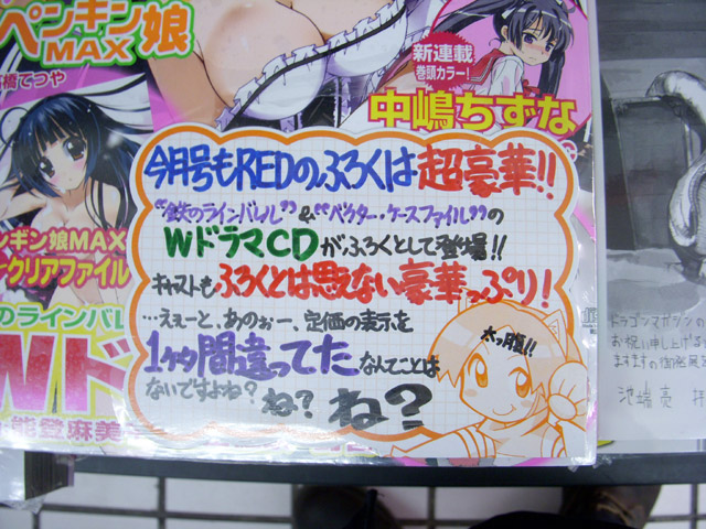 とらのあな1号店のPOPでは「今月号もREDのふろくは超豪華!!”鉄のラインバレル”&”ベクター・ケースファイル”のWドラマCDがふろくとして登場!!キャストもふろくとは思えない豪華っぷり!・・・えぇーと、あのぉー、定価の表示を1ケタ間違ってたなんてことはないですよね?ね?ね?」と書かれていました。
