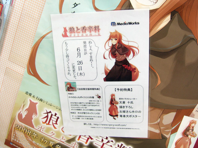 ソフマップアミューズメント館では、DS「狼と香辛料 ボクとホロの一年」(AA)が6月26日(木)に、DS「ななついろ★ドロップス タッチではじまる初恋物語」(AA)が5月15日(木)に発売日が変更になったとの告知が。