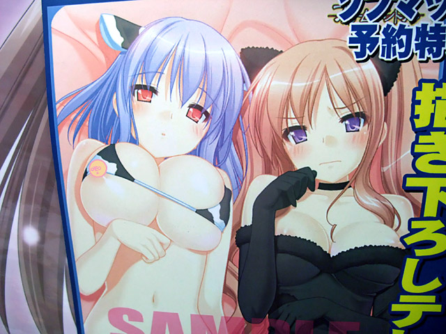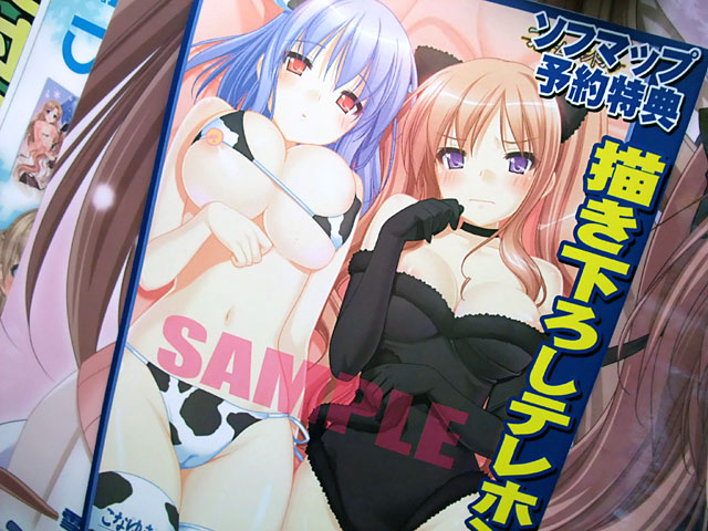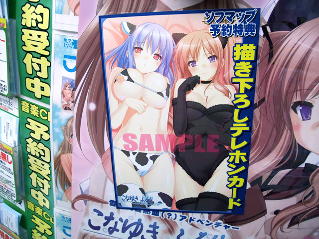 アキバOSさんによると、3月28日発売予定のブルームハンドルのエロゲ「こなゆき ふるり ~柚子原町カーリング部~ 初回限定版」(AA)のショップ特典テレカイラスト公開が始まっていますが、アキバOSさんが確認された際、SECRETで隠されていた乳首が隠されていない、ソフマップ特典の片乳首はみだし牛コス中原麻美&乳輪見えコス松島小雪イラストがソフマップPCゲーム・アニメ館1F店内で掲示されてました。