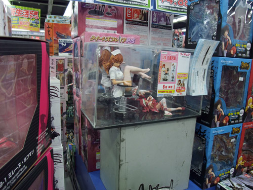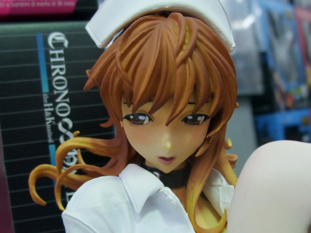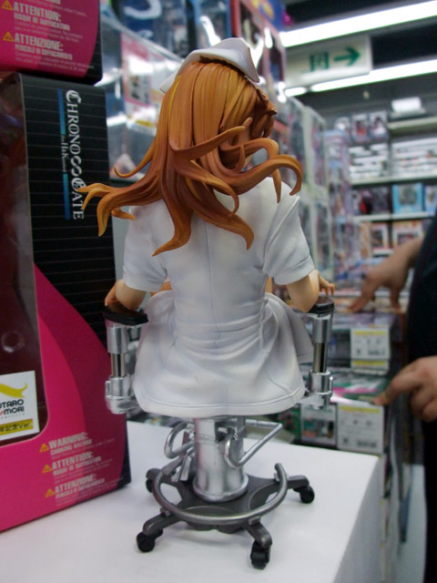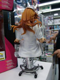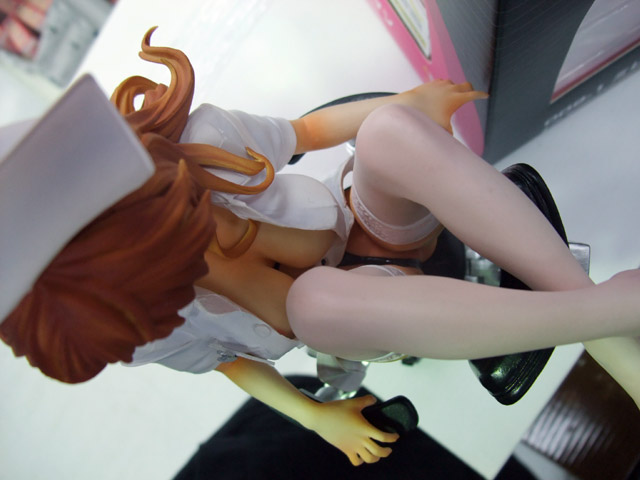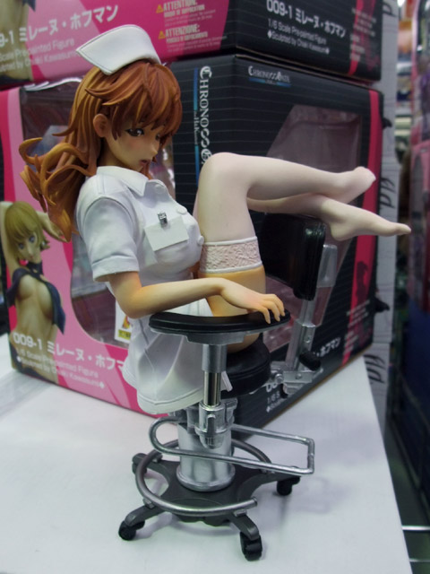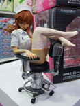 これは、以前ワンフェス2008冬での展示をお伝えした、G.J?のエロゲ「あなたの知らない看護婦~性的病棟24時~」(AA)のキャラで、おっぱい付抱き枕カバーにもなったキャラ「白鳥天音」をはだけたナース服姿で立体化したもので、クエスチョナーズの商品説明によると「『Queenボンジョルの!~女王は制服を脱いだ~』、妻とママとボイン』などで高い評価を得ている 佐野俊英氏 の原画を、WFや商業原型で大活躍中の原型師 片桐克洋氏 により立体化!片桐氏の独自の解釈で、 ゲームでは決して見ることができない『白鳥天音』の艶かしいポーズを再現しました!ゲーム中の「メガネっ娘システム」を再現したメガネの他、手術用の椅子、聴診器が付属します。しかも、パッケージは救急箱としても使える特別仕様!」と紹介されています。