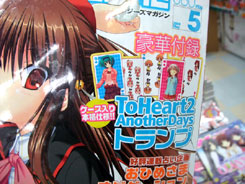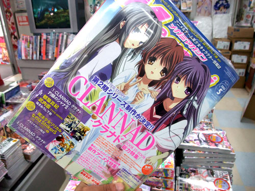 3月29日、30日が日曜日のため、「メガミマガジン 2008年5月号」(AA)、「電撃G’smagazine 2008年5月号」(AA)、「電撃HIME 2008年5月号」(AA)の3誌が1日早く発売されました。画像は、第2期製作決定した、アニメ「CLANNAD-クラナド-」特集掲載の「メガミマガジン 2008年5月号」(AA)。他、コトブキヤラジオ会館店頭で、コスプレ衣装の店頭販売等をまとめて。