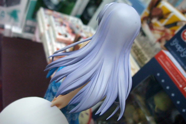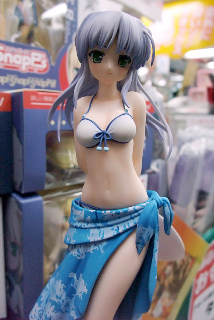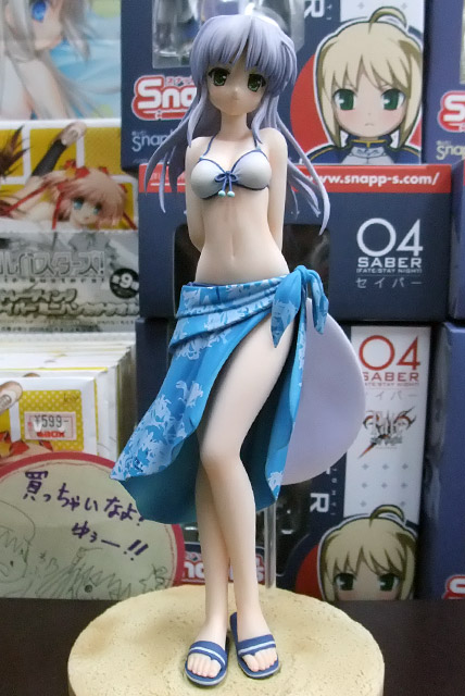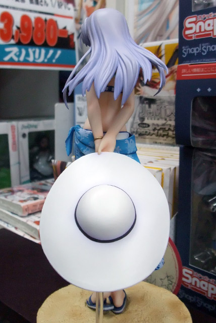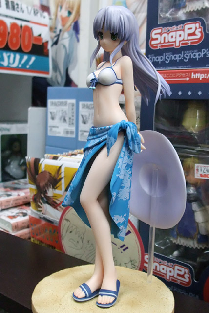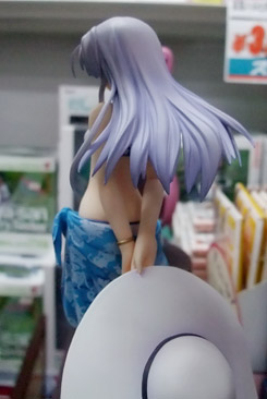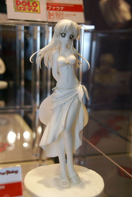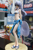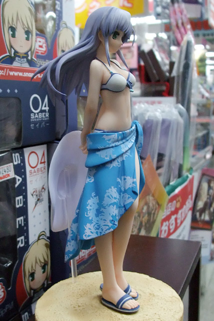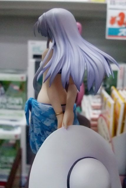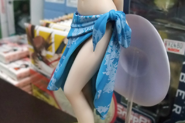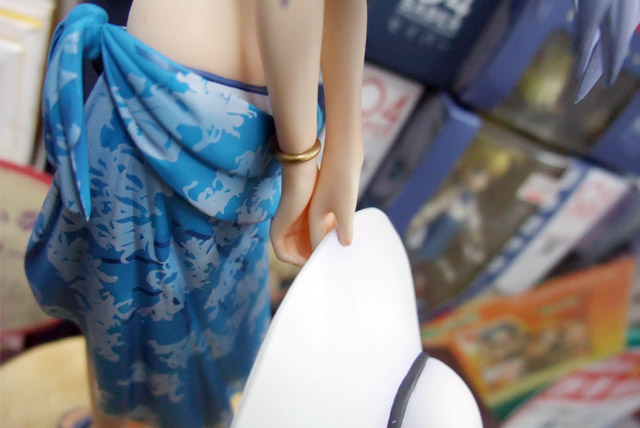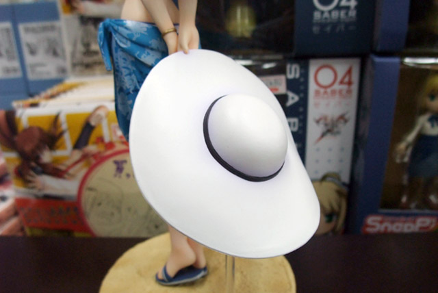 これは、ドリパ東京2007秋での展示もお伝えした、オーガストのエロゲ「夜明け前より瑠璃色な」のキャラ「フィーナ・ファム・アーシュライト」を水着姿で立体化したもので、マックスファクトリーの商品説明によると「正義感が強くまっすぐな性格の彼女を、恥じらいを帯びた表情、もどかしげなポーズの水着姿で再現しました。鮮やかな色彩のパレオと帽子は共に着脱可能。お好みでお楽しみいただけます。」と紹介されています。