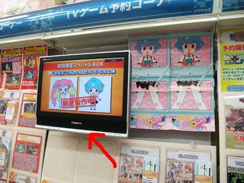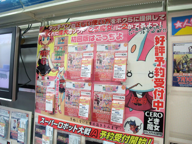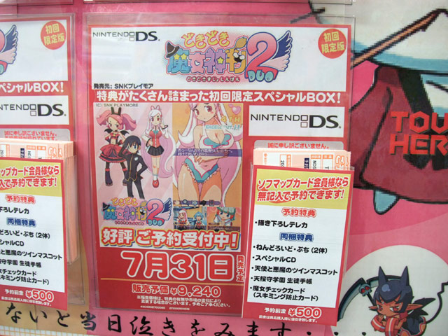 7月31日発売予定のDS「どきどき魔女神判!2 Duo 初回限定版」(AA)の店頭予約がアキバで開始していて、ソフマップアミューズメント館1Fの予約コーナーでは、店頭デモの放映も開始されていました。