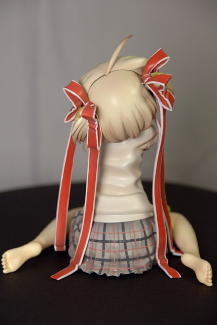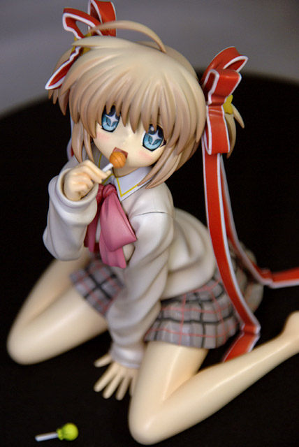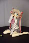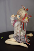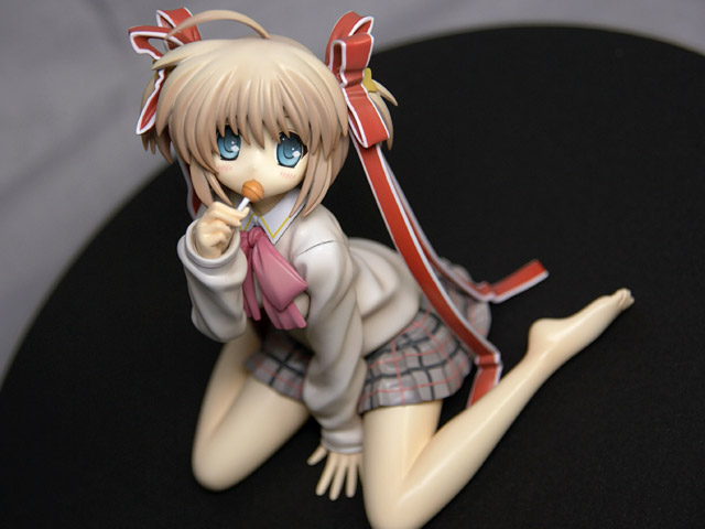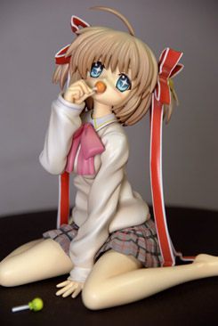 これは、以前サンプルレビューをお伝えし、6月に発売予定の「棗鈴」(AA)に続く、コトブキヤの「リトルバスターズ!」のキャラ立体化シリーズ第2弾として、「神北小毬」を立体化したもので、コトブキヤの商品説明によると『学園の屋上に忍び込み、お菓子を食べたり昼寝をしたり、のびのび過ごすことを趣味とする天然少女系ヒロイン「神北小毬」を、お菓子を食べているときの無邪気なシーンを切り取ったイラストを元に立体化致しました。お菓子を前に喜びを爆発させる瞬間に瞳に星が輝く彼女。製品では差替えにより、この表情も再現可能となっております。更にパンツにも秘密が!ドライヤーなどでパンツを温めると、縞々模様のパンツに変化が・・・。』と紹介されています。