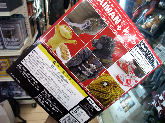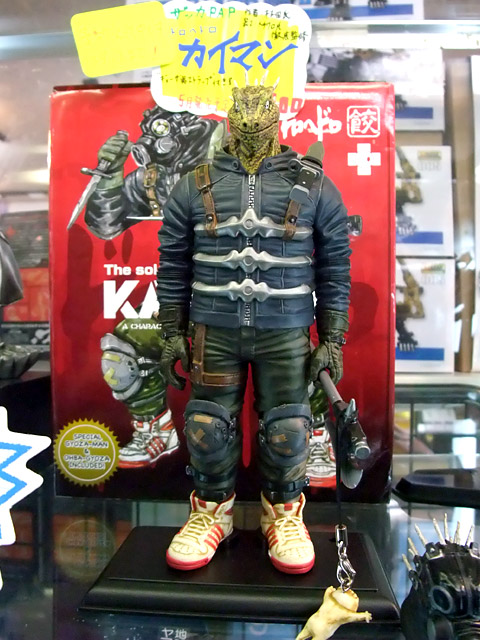 ザッカ ピー・エイ・ピー「ドロヘドロ カイマン」(AA)のサンプル展示がコトブキヤラジオ会館にて開始しています。これは、月刊IKKIに連載されている、「ドロヘドロ」の、魔法でハ虫類の頭に変えられた主人公「カイマン」を立体化したものです。その特徴的なハ虫類の頭含め、全体の造形、塗装ががものすごいクオリティです!付属の「ギョーザ男ストラップ」と「餃子」もやけにリアルw