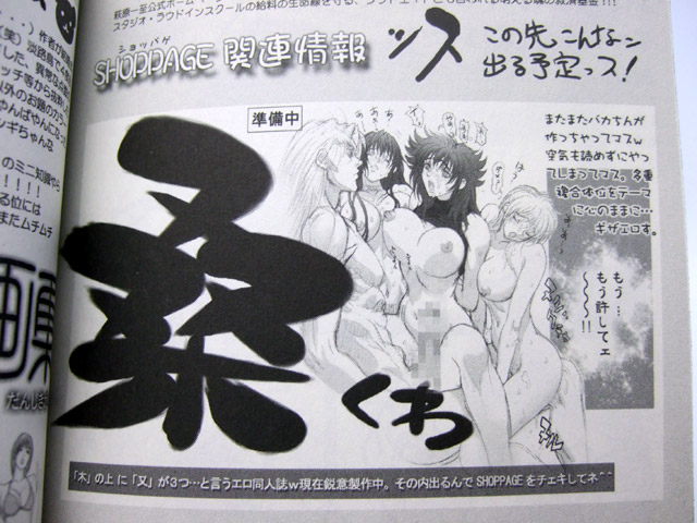 で、巻末には萩原一至氏のオフィシャルグッズショップSHOPPAGEで販売・販売予定の商品紹介ページが掲載され、中には『「木」の上に「又」が3つ・・・というエロ同人誌w』として、大人向け同人誌「桑(くわ)」のイラスト付き紹介もありましたw