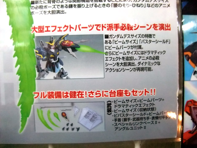 ■ ガンダムデスサイズの特徴である「ビームサイズ」「バスターシールド」にビームパーツが付属。さらにビームサイズにはドラマティックエフェクトを追加し、アニメの必殺シーンを大胆演出。ダイナミックなアクションシーンが再現可能。