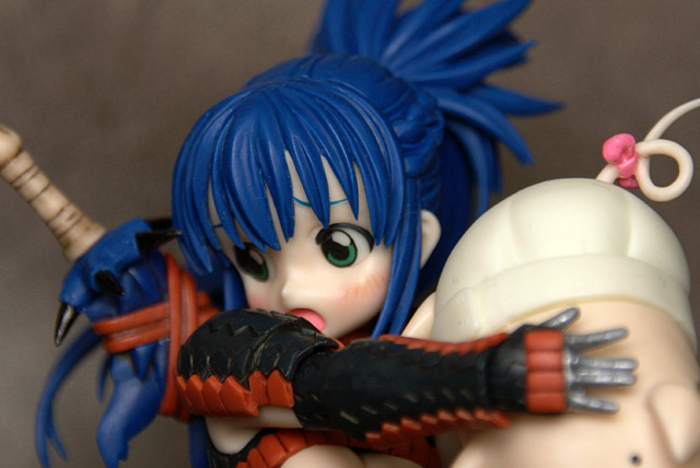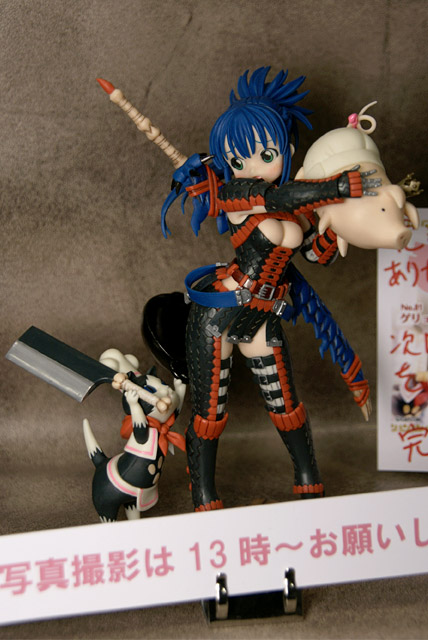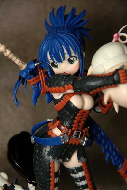 これは、「MONSTER HUNTERが好きで、無印から2までしつこく遊んでいます。3が楽しみです。」とご自身もモンハンプレイヤーである、漫画家のいぬぶろ氏がアレンジした、「モンスターハンター」のゲリョスS装備を着た女の子をカラーレジンキットとして立体化したもので、りゅんりゅん亭の作品説明によると