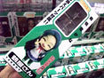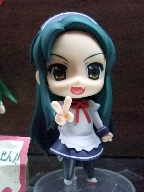 これは、以前ドリパ東京2007秋での展示もお伝えした、「涼宮ハルヒの憂鬱」のキャラ「鶴屋さん」を劇中のウェイトレス姿でねんどろいど化したもので、グッスマの商品説明によると『SOS団のねんどろいど化、4人目は名誉顧問「鶴屋さん」が文化祭時のウェイトレス姿で登場です。通常の表情の他に「朝比奈ミクルの冒険 Episode00」で演じていた「ユキの操り人形時の顔」と「爆笑顔」が付属。カチューシャは取り外し可能なので、他のハルヒシリーズと組み変えることで違った姿が楽しめたり・・・。おまけパーツとして操り人形時の腕と足、ピースした手首、トレイ&持ち手首が付属。シリーズで一緒に並べて、作中のワンシーンをゆる~く再現してみては?』と紹介されています。