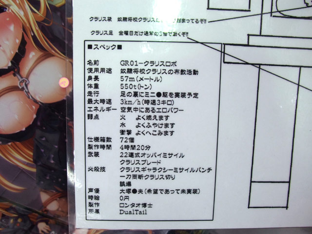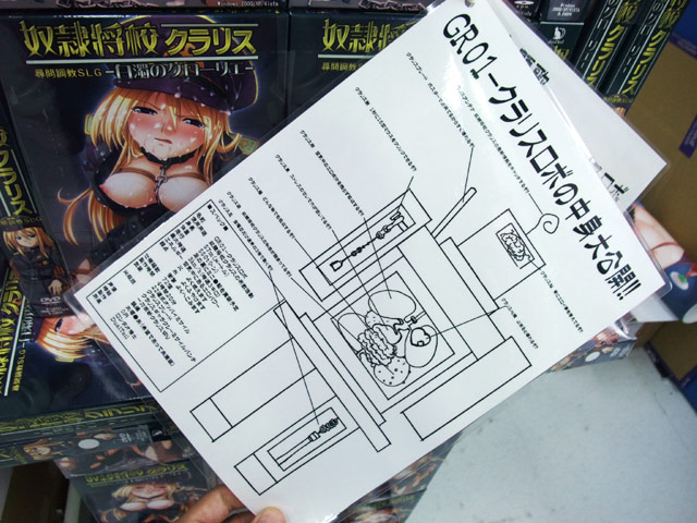 4月25日発売予定のDual Tailのエロゲ「奴隷将校クラリス ~白濁のグローリエ~」(AA)ですが、ソフマップアミューズメント館5Fカウンター横に、その「奴隷将校クラリス」のダミーパッケで作られた「GR-01 クラリスロボ」が展示されていました。つけられたスペック表によると、「エネルギー 空気中にあるエロパワー」で、「声優 大塚●夫(希望であって未実装)」とのことw