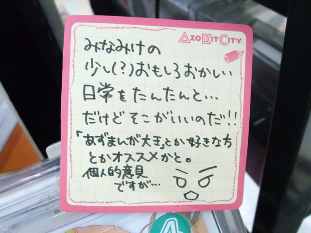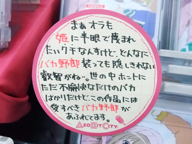 ゲームシティのPOPでは「まぁオラも姫に半眼で蔑まれたいクチなんですけど、どんなにバカ野郎装っても隠しきれない叡智がね・・。世の中ホントにただ不愉快なだけのバカばかりだけど、この作品には愛すべきバカ野郎があふれてます。」とか『みなみけの少し(?)おもしろおかしい日常をたんたんと・・・だけどそこがいいのだ!!「あずまんが大王」とか好きな方とかオススメかと。個人的意見ですが・・・』などと書かれていました。