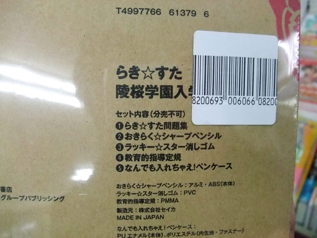 セット内容は、「らき☆すた問題集」「おきらく☆シャープペンシル」「ラッキー☆スター消しゴム」「教育的指導定規」「なんでも入れちゃえ!ペンケース」。