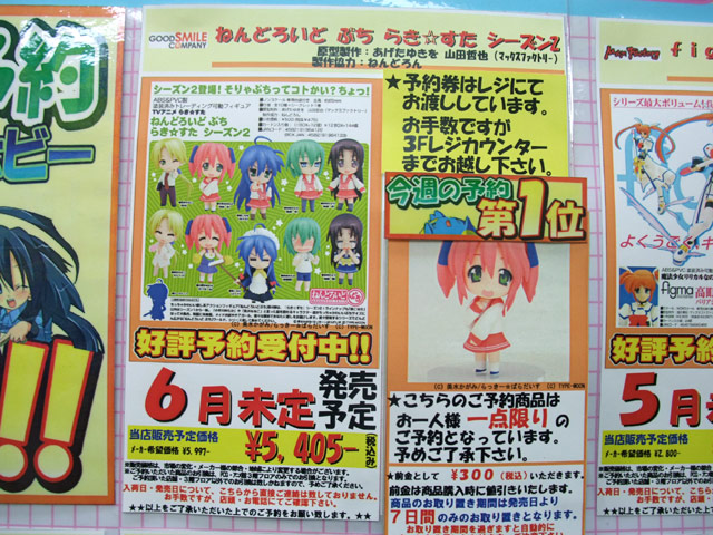 ソフマップ秋葉原PCゲーム・アニメ館の週間フィギュア予約ランキング4/7~4/13付分をお伝えします。今週の1位は、集計期間の途中から予約開始だったため、先週は6位だった、「ねんどろいど ぷち らき☆すた シーズン2」(AA)が、一気に1位まで上昇していました。やはり強い!「Figma なのは」(AA)も2位に落ちたとはいえ、相変わらずの強さを見せていました。